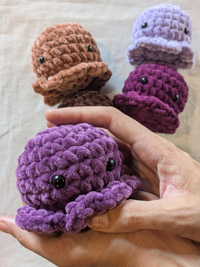 Chaque pieuvre est confectionnée avec soin selon la technique japonaise de l’amigurumi, garantissant un rendu de haute qualité et une texture ultra douce au toucher.